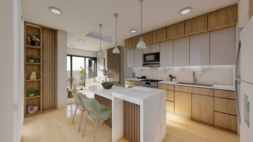 Diseño de un departamento minimalista en el Callao, donde la luz, el espacio y la funcionalidad se integran en una distribución abierta y contemporánea. También incluye diseño interior.